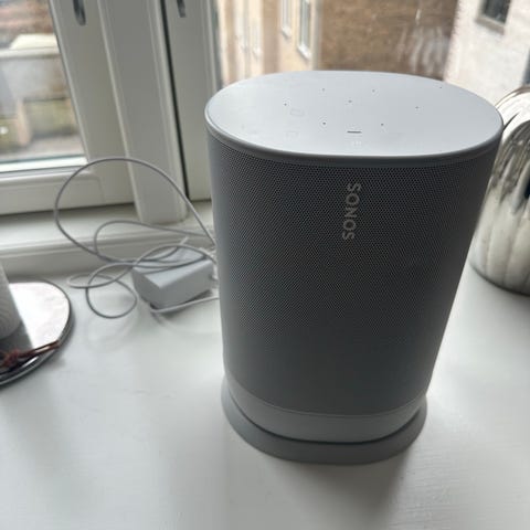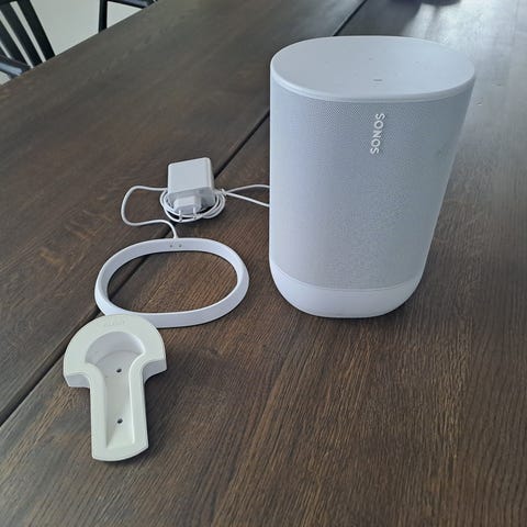 Sonos Move 1 trådløs højttaler i hvid. Bærbar højttaler med integreret håndtag og opladningsbase som vist på billederne. Enheden har touchknapper på toppen til styring af lyd og afspilning. Velegnet til brug i hjemmet og til at flytte mellem rum eller tage med ud, hvor der er behov for trådløs musikafspilning. Købt i 2022, original kvittering haves.