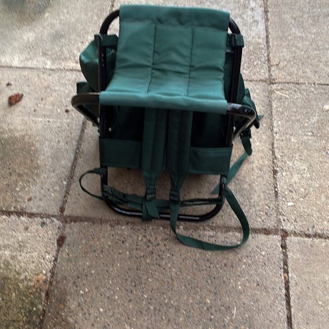 Rygsæk med integreret stol i grøn farve. Tasken har flere lommer, herunder frontlomme med lynlås og sidelommer i net. Rygsækken er monteret på en metalramme, der fungerer som sammenklappelig stol, egnet til fx ture, fiskeri eller jagt. Justerbare remme på forsiden og snørelukning øverst sikrer, at indholdet holdes på plads under transport.