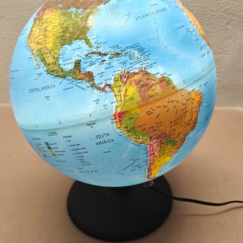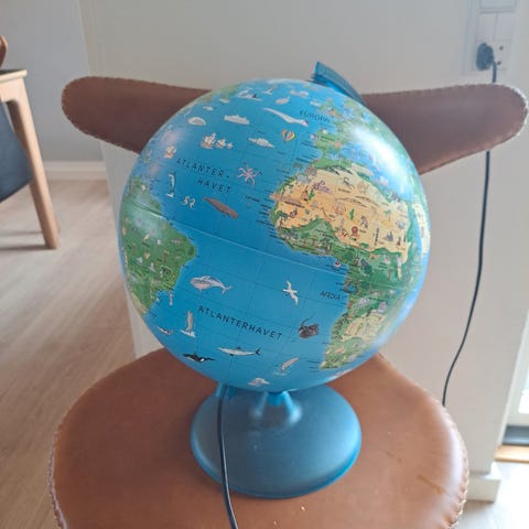 Globuslampe med fod, købt i boghandel . Mærket er Technoglobus/ Melinera.