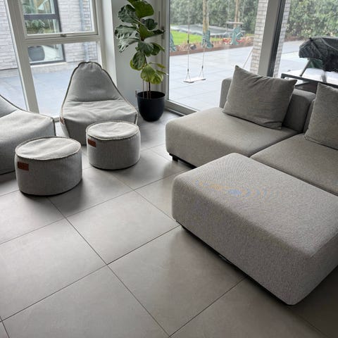 Pris pr. sæt med én sækkestol og én puf. Serving tray sælges til 500,-