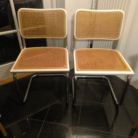 2 af stolene har intakt flet og den tredje har et kosmetisk hul i ryglænet. Ellers fin stand.