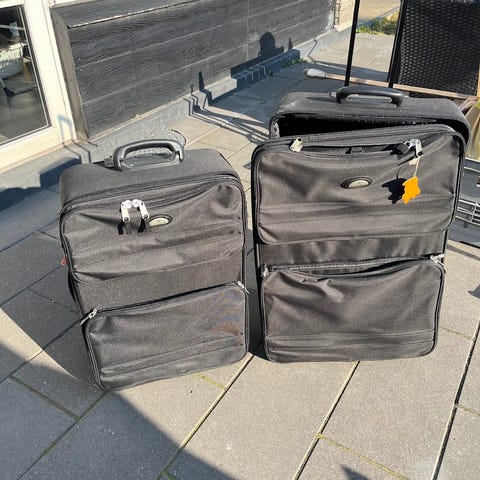 To kufferter - World Traveller kuffertsæt - trolley - i sort. Begge kufferter har udvendige lynlåslommer samt indvendig foring med mønster og spændestropper, rum med lynlås under låget samt lille sidelomme. Mål ca. H 75 x B 50 og H 65 x B 40. Den største har ikke været brugt. Afhentning.