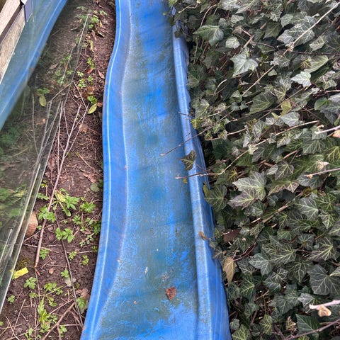 Rutsjebane i grøn plast. Rutsjebanen er bølgeformet og beregnet til montering på et legetårn eller en forhøjet platform i haven. Den er fremstillet i hård plast og har integrerede monteringspunkter i toppen. Egnet til udendørs brug som del af legeplads eller legetårn til børn.