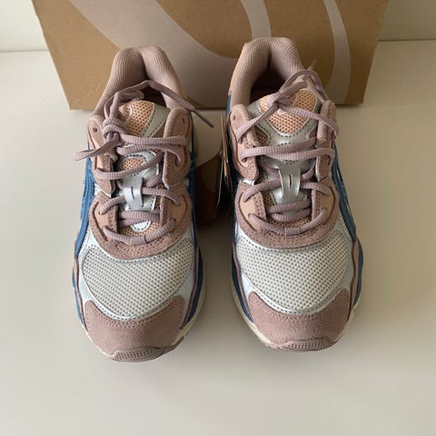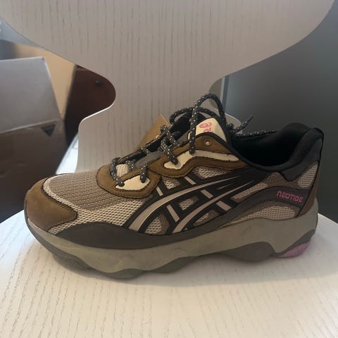 Asics sneakers i str. 40. Modellen er i brun nuance med lyse detaljer og snørelukning. Overdelen er i mesh og syntetisk materiale med Asics-logo på siderne. Skoene har polstret hælkappe og tunge samt kraftig gummisål, der egner sig til hverdagsbrug og let træning.