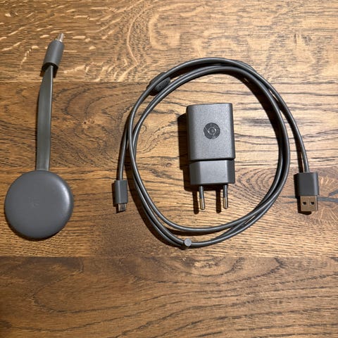 Google Chromecast 3 med strømforsyning og USB‑kabel i sort. Har ikke været brugt ret meget