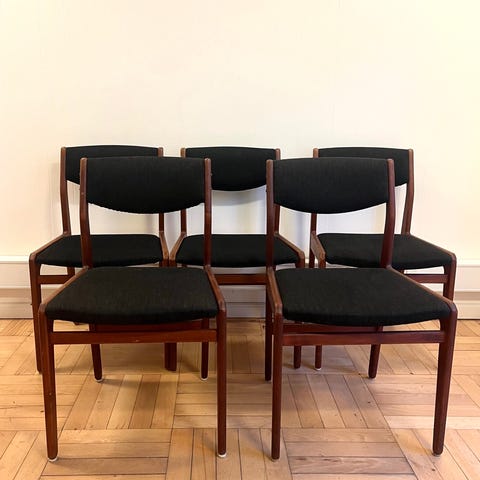 2stk sortmalede snedkerstole i teak træ fra 1960’erne betrukket i uldstof.