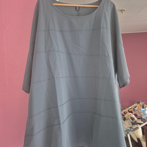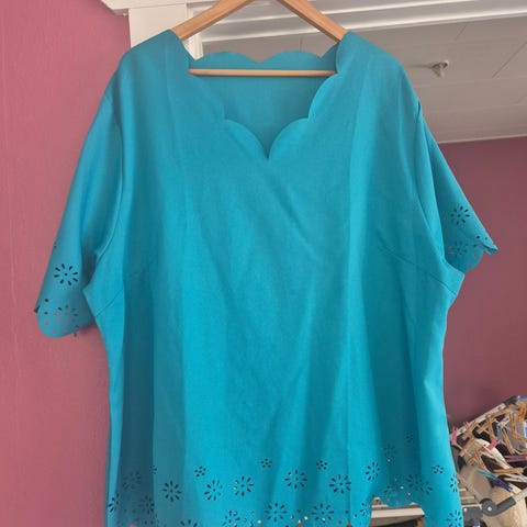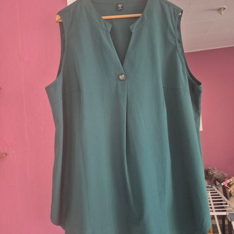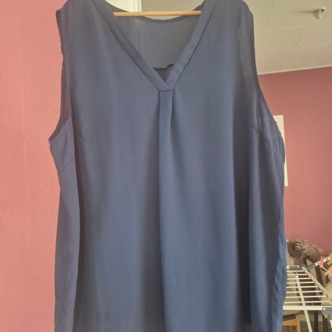 Pæn blå Bluse/tunika. Bluse i blå chiffon, uden ærmer, oval hals, 9 knapper ned foran. I pæn stand.