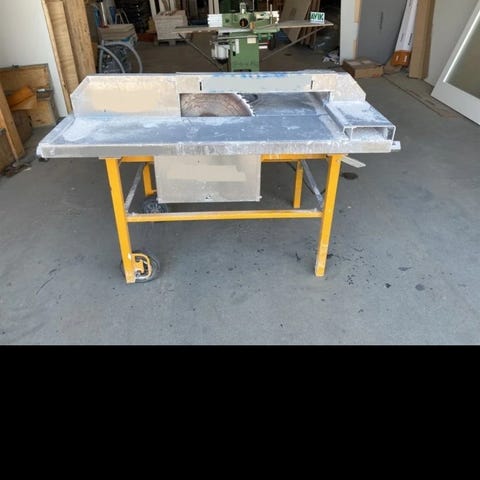 Podek gasbetonsav på stativ med rektangulær bordplade og integreret savklinge i midten. Savbordet står på et metalstativ med hjul i den ene ende, hvilket gør det lettere at flytte rundt på. Egnet til porebeton-gasbeton