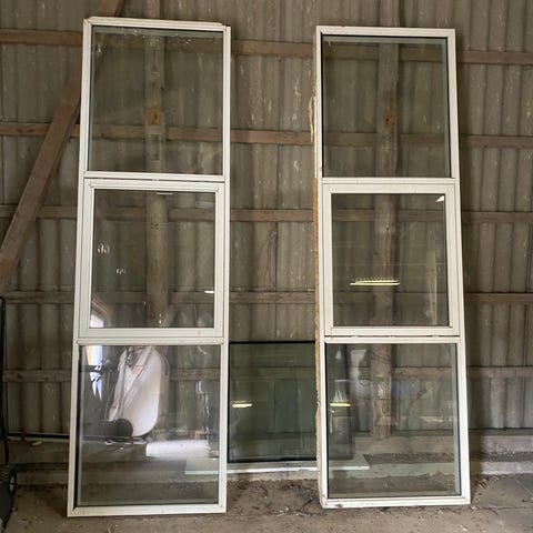 Vinduer og dørparti i hvidmalede rammer. Vinduerne er 2 lags termoglas, rammerne er af plastik på begge sider. Vi er ved at renovere udestuen, og vinduespartierne (3 hele sider) vil blive pillet forsigtigt ud i starten af Maj, hvorefter de kan afhentes.