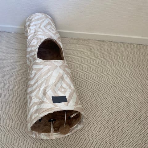 More Cats & Dogs kattunnel i stof med geometrisk mønster i beige og lyse nuancer. Indersiden er foret med blødt plys i brun farve. Tunnelen har åbning i siden samt små fastgjorte stropper og en hængende bold indvendigt. Egnet som legetunnel og gemmested til katte eller små kæledyr indendørs.