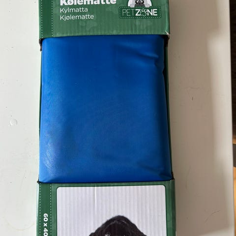 To rektangulære kølende hundetæpper. Det ene tæppe er blå med dråbemønster, det andet er beige med quiltet mønster og kantbånd.