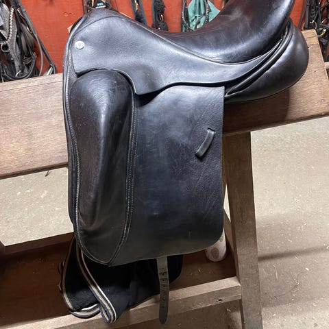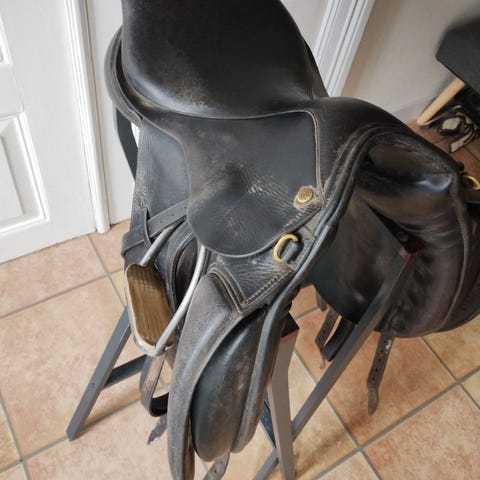 Flot og velholdt dressursadel i sort læder. Sadlen har dybt sæde og god støtte. Der sidder et blåt kopfjern sadlen.
