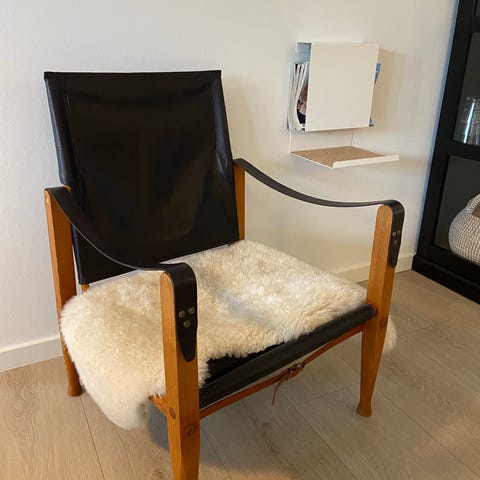 Wilhelm Kienzle lænestol Safari Chair. Tegnet 1928. Trækonstruktion der kan skilles ad, beklædning og armlæn i brunt smukt patineret skind. 88x55x60 cm