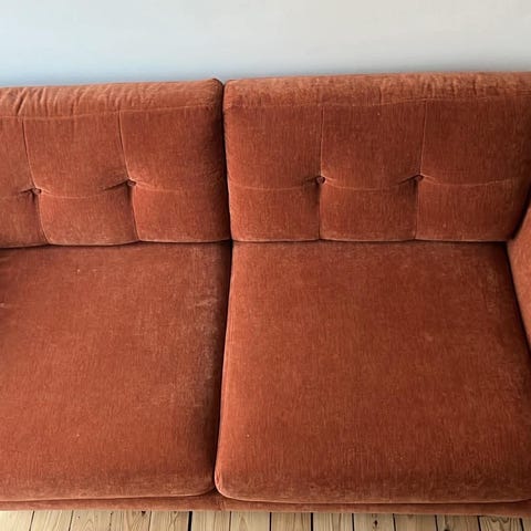 Har stået i pendlerlejlighed siden marts 2024. Let brugt og fin stand. Nypris 7.000,- med ben udført i eg. Puder koster 600,-