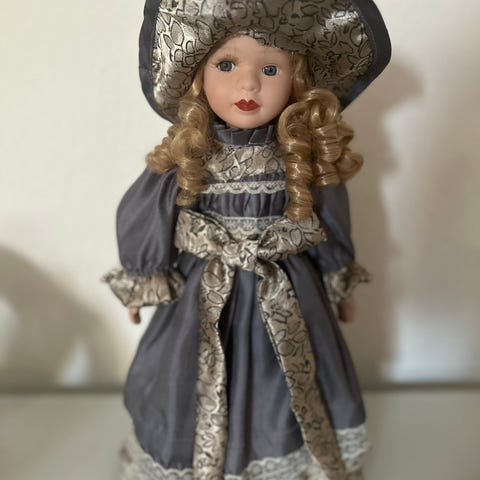 Porcelænsdukke med mørkt hår, slangekrøller, lyserød kjole. Står på stativ. H: 33 cm.