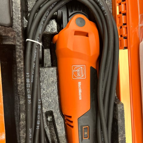 Fein Multimaster multiværktøj med kuffert og forskelligt tilbehør. Sættet omfatter selve multiværktøjet samt flere slibepuder, slibepapir i forskellige former og kornstørrelser, og diverse adaptere. Velegnet til slibning, skæring og andre præcisionsopgaver i værksted eller ved renovering. Leveres i robust plastkuffert med indlæg til maskine og tilbehør.