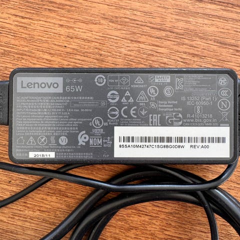 Lenovo 65W Standard AC Adapter USB-C oplader til bærbar computer. Effekt på 65W og tilslutning via USB Type-C stik. Strømforsyning med aftagelig netledning til brug i stikkontakt. Velegnet til kompatible Lenovo bærbare computere, der oplades via USB-C.