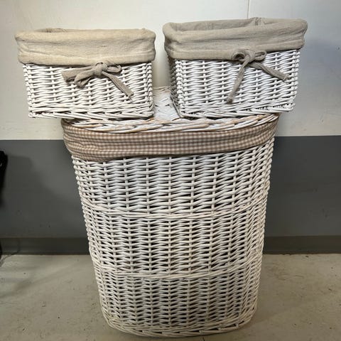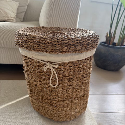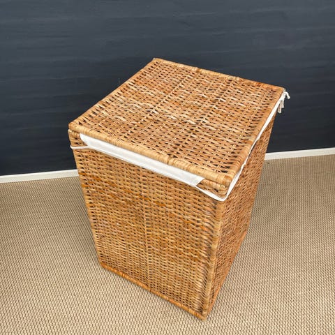 Vasketøjskurv på hjul i brun flet. Kurven har låg og bærestrop på siden, samt hjul i bunden, så den er nem at flytte rundt. Velegnet til opbevaring af vasketøj eller anden tekstilopbevaring i hjemmet.