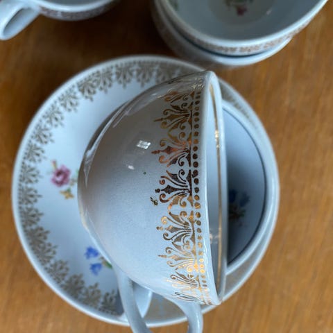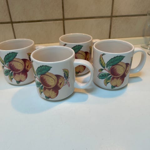 Arabia kopper med rosenmotiv. Små porcelænskopper med hank og præget mønster nederst på koppen samt dekoration med røde og grønne blomster. Velegnet som kaffekopper eller til andre varme drikke. Stempler fra Arabia under bunden angiver producenten.