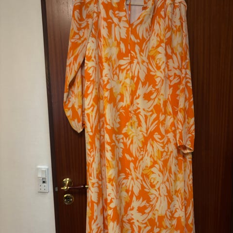 Paris hverdagskjole i beige polyester i one size. Kjolen har lange ærmer med bindebånd ved ærmekanterne og et løstsiddende snit. Materialet er glat polyester med et lyst, dekorativt mønster over hele kjolen. Velegnet som hverdagskjole til kvinder. Helt ny aldrig brugt. Sælges grundet returret som er overskredet.