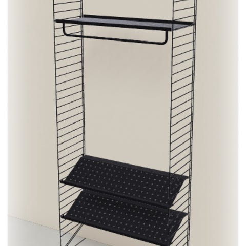 String reolsystem designet af Nils Strinning med integreret skrivebord og 6 hylder hylder i valnød. Systemet består af sidegavle i sort metal og hylder samt skrivebordsplade, der kan anvendes som arbejdsplads eller opbevaringsplads. Egnet til brug i stue, kontor eller værelse, hvor der er behov for kombineret skrivebord og reol. På billederne ses let slitage på kanten af skrivebordet.