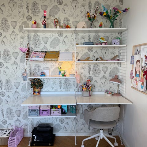 String reolsystem med skrivebord og hylder træ