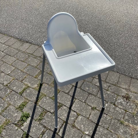 IKEA højstol med bakke i hvid plast og metalben. Højstolen har integreret bakke og enkel sædeenhed med ryglæn. Der medfølger sele til fastspænding af barnet. Egnet til små børn, der kan sidde selv, til brug ved spisebord eller som selvstændig spiseplads. Benene er aftagelige, så stolen er nem at opbevare og flytte rundt på. Overfladerne kan tørres af med en fugtig klud.