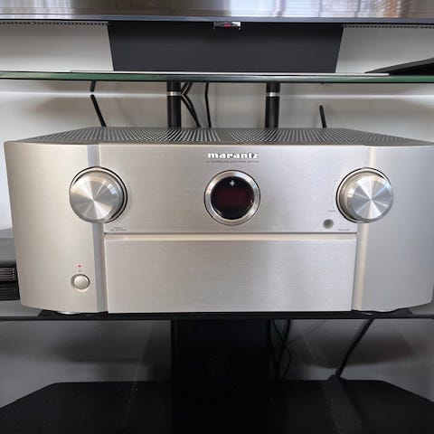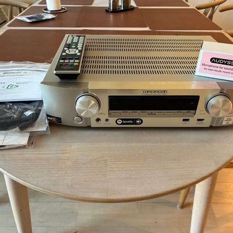 Marantz surround receiver i sort finish. Enheden har frontklap med adgang til betjeningsknapper og tilslutninger på fronten, herunder bl.a. USB og analoge indgange. Bagsiden er udstyret med et stort antal analoge og digitale ind- og udgange, højttalerterminaler til flere kanaler samt HDMI-tilslutninger (ind/ud), hvilket gør den egnet til hjemmebiograf og multikanal lydopsætning. Modellen understøtter radiofunktion med angivet frekvensområde og S/N-forhold ifølge specifikationsbilledet. Velegnet som central enhed i et surroundsystem med flere lyd- og billedkilder. Fjernbetjening og mic følger med.