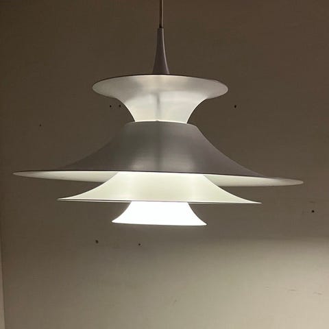 Meget velholdt Radius pendel i original hvid lakering, Ø47 cm. Designet af Erik Balslev for Fog & Mørup. Elegant pendel, der gir et utrolig smukt lys - FLOT form og fin vintage stand.
