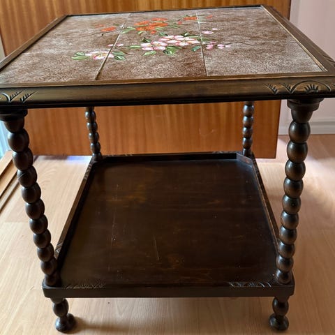 Sidebord med kvadratisk bordplade bestående af fire keramiske fliser med blomstermotiv i midten. Stel og ben er i mørkt træ med drejede ben og tværstiver forneden. Bordet egner sig som lille sofabord, lampebord eller plantebord i stue, entré eller soveværelse.
