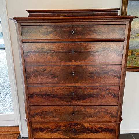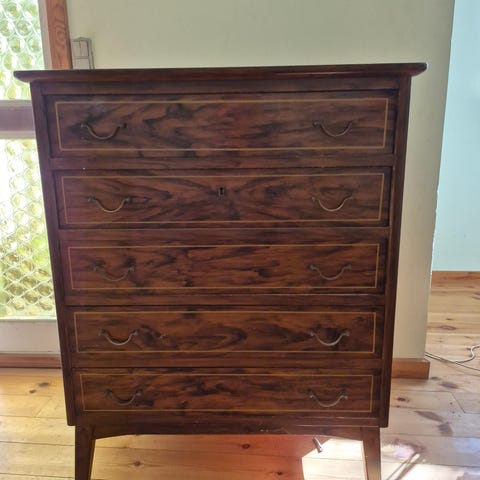 Kvalitets kommode i træ, maghoni eller palisander finér. 4 skuffer, den øverste beklædt med filt og med en ekstra "smykkeskuffe". Af ældre dato fra ES møbler. Yderst velholdt, bortset fra et hul i filten i den ene skuffe.