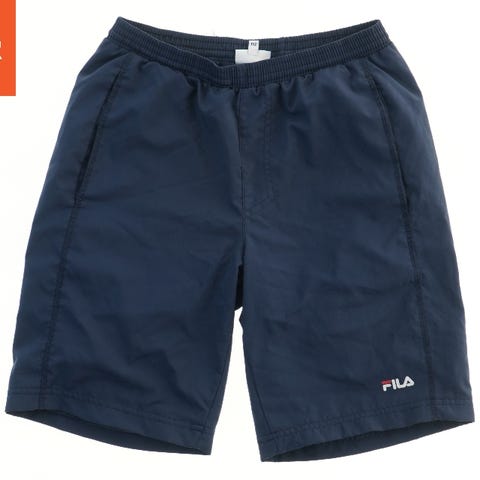 Et par blå shorts fra FILA med elastisk talje. Shortsene har et trykt motiv af en hund og FILA-logoet på forsiden. De er enkle og velegnede til afslappet brug.