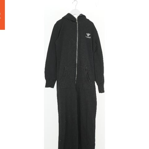 Sort heldragt med lange ærmer og ben. Dragten har elastik ved taljen og lynlås foran. Der er gule refleksstriber på ærmerne og nederst på benene. Dragten har en hætte.