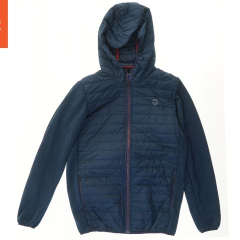 En jakke med hætte lavet af softshell-materiale. Jakken har en gennemgående lynlås foran og to lynlåslommer på forsiden. Den er blå med en kontrast mellem lysere og mørkere nuancer. Ærmerne har elastiske manchetter.