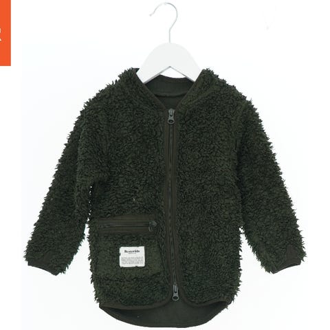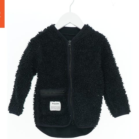 Jakke lavet af fleece-materiale med en lynlås foran og en lille lomme på brystet. Den er ensfarvet blå både foran og bagpå.