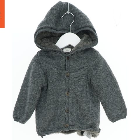 Hættetrøjen er strikket og har en grå farve. Den har en hætte og lukkes foran med knapper og lynlås. To lommer er placeret på fronten, og der er ribkanter ved håndleddene og forneden.