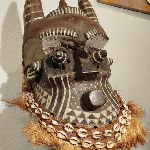 Dette Kuba-maske, kendt som Ngaady A Mwaash, viser Kuba-folkets kunstneriske færdigheder med sine geometriske mønstre og skaller som udsmykning. Sådanne masker havde betydning i Kuba-ceremonier.