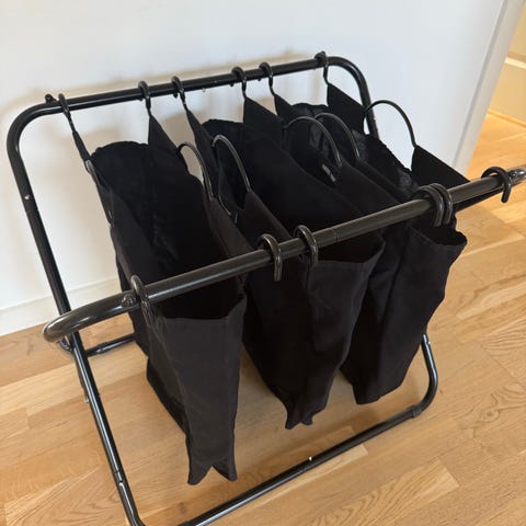 Sælger denne virkelig flotte og stabile vasketøjsholder med 4 aftagelige kurve. Den har et pænt og moderne udtryk med sort metalstel og top i trælook, så den både er praktisk og ser godt ud.