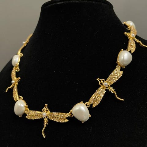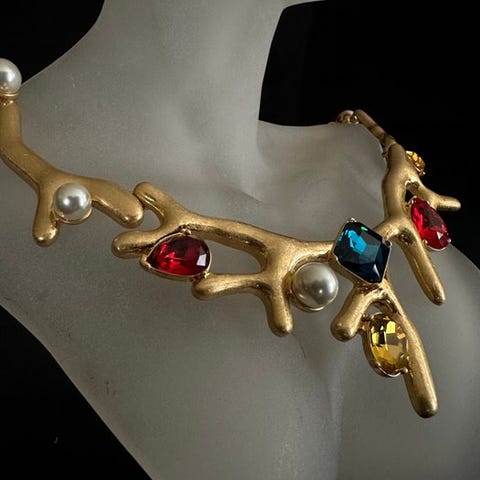 Dames halskæde i guldfarvet metal med krystaller og emalje i blomsterdesign, tilknyttet Oscar de la Renta, længde ca. 36 cm med 9 cm forlængelse, bredde ca. 60 mm, vægt 150 g, ny. Klik på den blå "gå til varen" knap, for at købe eller byde på denne vare. Den samlede pris vil blive vist inden du afgiver dit bud.