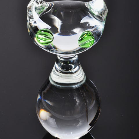 Glaskunst, motiv: Kat, Charmerende svensk glaskunst i form af en siddende kat. Katten sidder opret og er fremstillet i klart glas. Købt i Glasriket i Småland, men desværre husker jeg ikke længere præcist ved hvilken glashytte. Katten er 16 cm høj og er fuldstændig fejlfri. Står på Mols men kan gratis leveres i Aarhus og Ebeltoft eller sendes billigt med GLS på købers regning