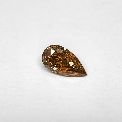 Pear-formet diamant med vidunderlige gule og orange nuancer, stærkt mættede.