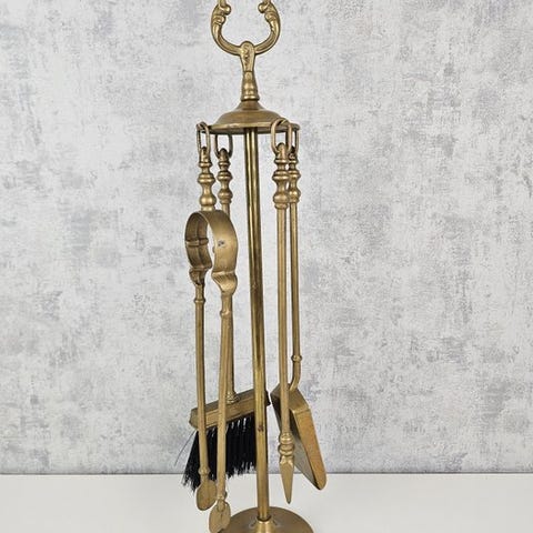 Meget smukt pejsestativ i lang, formet som en genstand i massivt bronze og forgyldt messing, nyttigt til din pejs og grill med 5 dele og tilhørende stand, fra midten af det 20. århundrede. Dimensioner: 66 cm høj, 16 cm støtte i fremragende stand og ren. Sendt fra Frankrig hurtigt. God auktion til alle!