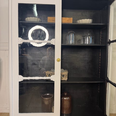 Smukkeste vitrineskab i en sød, cremefarvet nuance og indvendigt malet i en varm terracotta/rosa farve, som giver en virkelig fin kontrast og fremhæver alt det, der står i skabet <3
