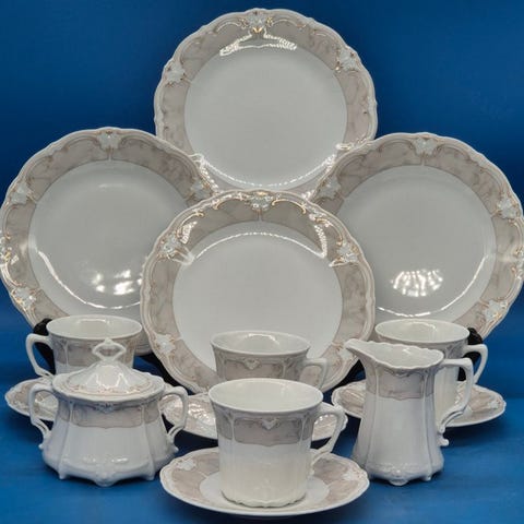 Dette raffinerede tyske porcelænsservice udføres i varmt ivory-kremet hårporcelæn med substansfuld håndpåført gyldne kantdekoration og skulpturel form fra midt-20. århundrede. De elegante låg med gyldne topfigurer, facetterede håndtag og afbalancerede proportioner giver sættet en luksuriøs, men tidløs tilstedeværelse ved bordet. Alle dele er i ubrugt, skabsbehandlet stand med brillant glasur og intakt guld.