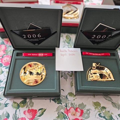 Til alle medfølger rødt bånd med årstal til ophæng.