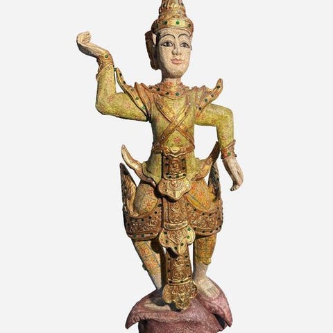 En udhult træskåret antik beskyttende figur med vinger fra Myanmar, cirka 1940–1950 dateret, med partiel forgyldning og farvede glasindlæg, ca. 23 cm bred, 18,5 cm høj og 5 cm dyb. Klik på den blå "gå til varen" knap, for at købe eller byde på denne vare. Den samlede pris vil blive vist inden du afgiver dit bud.