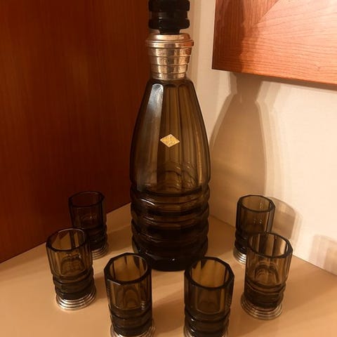 Prægtfuldt likørservice i gennemsigtigt krystal med rige gyldne dekorationer og hvide indgraveringer. Består af en karaffel, en isbøtte og 6 matchende små glas.