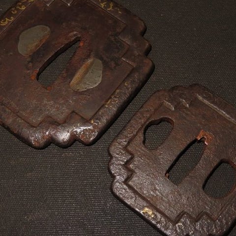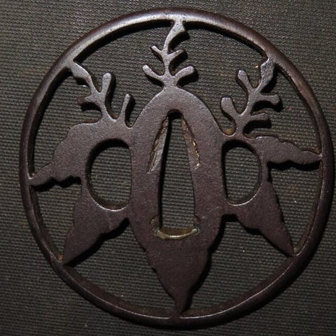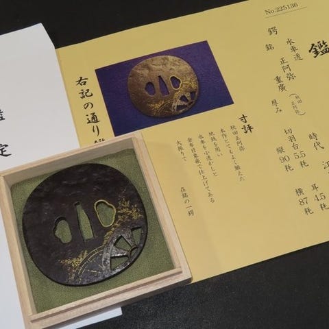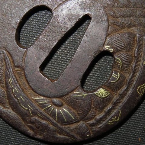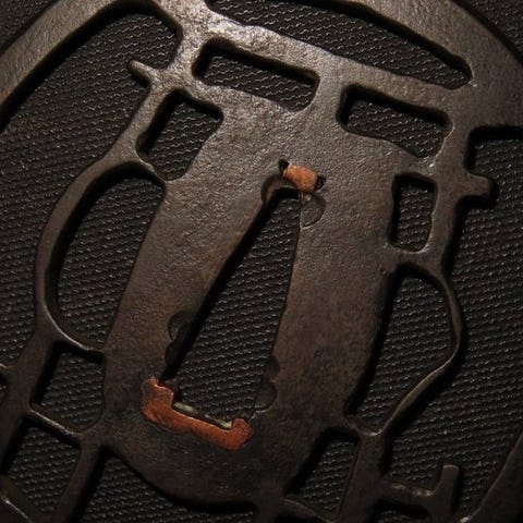 Originalt Edo-periode smedjerjern tsuba fra Japan med guldindlæg, kobber og sølv iroe åben værk, mål 7,6 × 7,2 × 0,5 cm, vægt 110–170 g med æske, fra et antikmarked og i fornuftig stand. Klik på den blå "gå til varen" knap, for at købe eller byde på denne vare. Den samlede pris vil blive vist inden du afgiver dit bud.