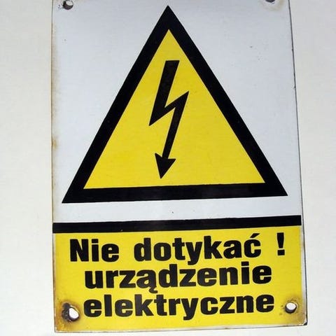 Gammelt emaljeskilt, Pas på strøm. Emaljeskilt Polen / Polen. Dekorationsdesign Polen