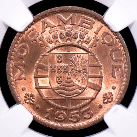 Angola, Portugisisk Republik, mønten 2 ½ Escudo fra 1953, vurderet MS64 af NGC, sammensætning CN, vægt 3,50 g, diameter 20,00 mm, cert. nr. 5780976004. Klik på den blå "gå til varen" knap, for at købe eller byde på denne vare. Den samlede pris vil blive vist inden du afgiver dit bud.